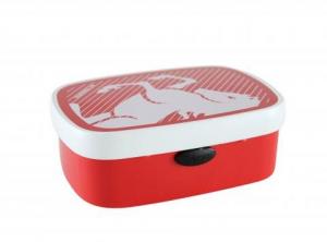 De broodtrommel is gekleurd in het rood en wit van FC Twente.